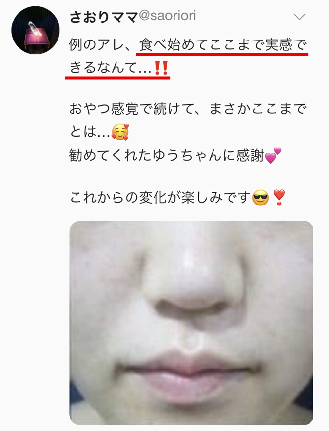 ほうれい線が気になってきて、エイジングケア商品を色々試していたところ、ネットで見つけたのをきっかけに購入。食べ始めてから、ほうれい線が目立たなくなってきた様に感じてます。娘に「お母さんなんか綺麗になった?プチ整形かなんかしたの?」と言われ、本当に嬉しいです。
