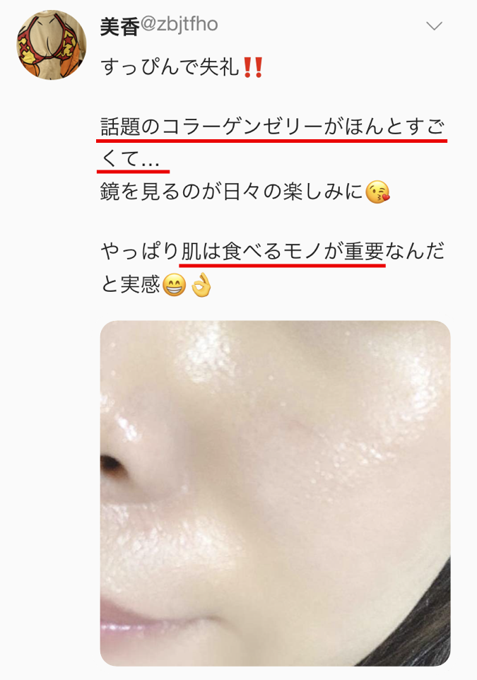 27歳からほうれい線が気になりはじめ、それ以来高級化粧品やエステ、コラーゲンサプリを試してみたのですが全然ダメ。友達にこのゼリーを勧められて試しましたが「こんなので肌が変わるわけない」と思っていました。でも、びっくりすることに5年以上悩んできたほうれい線が気にならなくなってきたんです!あまりにも簡単なので、本当に衝撃でした。旦那に「黙って整形でもしてきたのか」と怒られるほどの見た目の変化に、飛び上がるほど嬉しいです。★★★★★★★