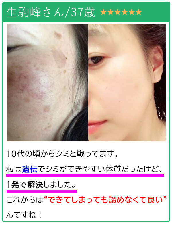 どんなにスキンケアを頑張っても年々増えていくシミに嫌気がさし、思い切って某美容外科でレーザー治療をしましたが、ものの1年弱でシミが復活。