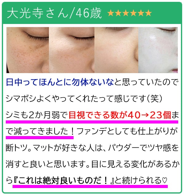 女性なら誰でもする作業(メイク)をこれに変えるだけなので、シミやそばかすに悩んでいる人はぜひ♪