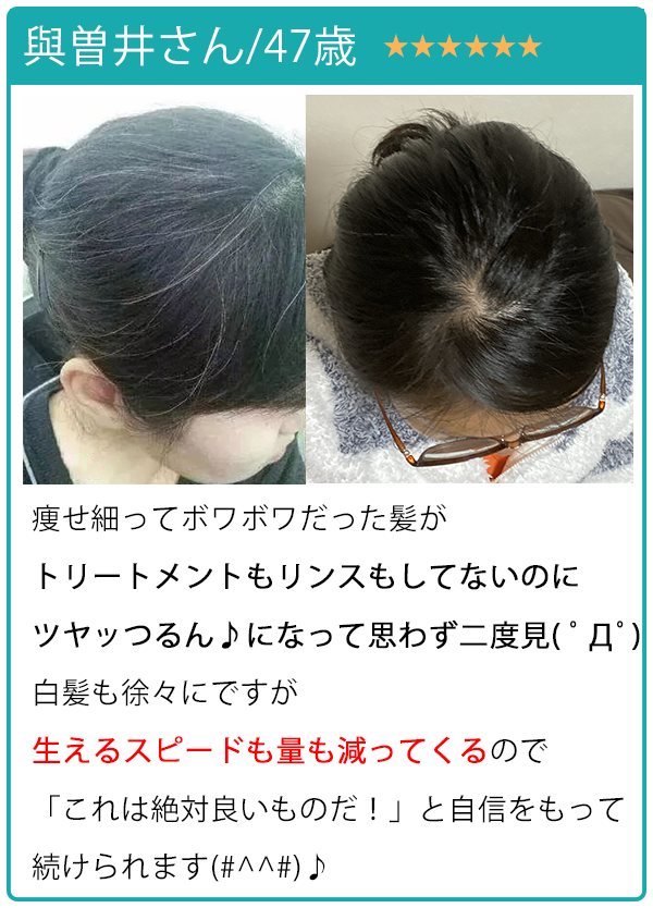 おかげで、頭皮の不快感も収まり、やせ細った髪にもハリと艶が戻ってきた気がします♡