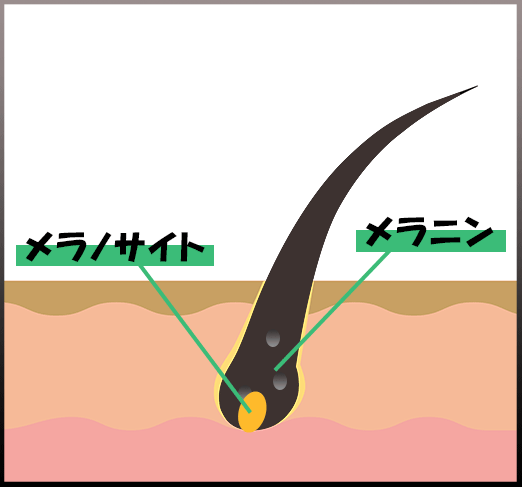 本来、髪は白い毛でメラノサイトで作られる「メラニン」が付くことで黒色に変化するんだそう。