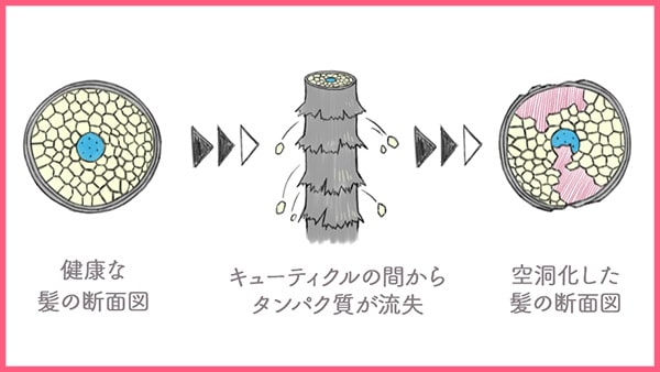 この空洞化により、うねり、パサつき、広がりなどのヘアトラブルを引き起こしてしまうんです。