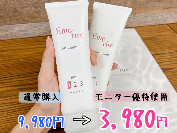 貴重な美髪粒子を配合しているので、シャンプー&トリートメントで9,980円と少々可愛くないお値段のエメリル😌(実際に使うと、それでも安いと思ってしまう感動はありますが。。)