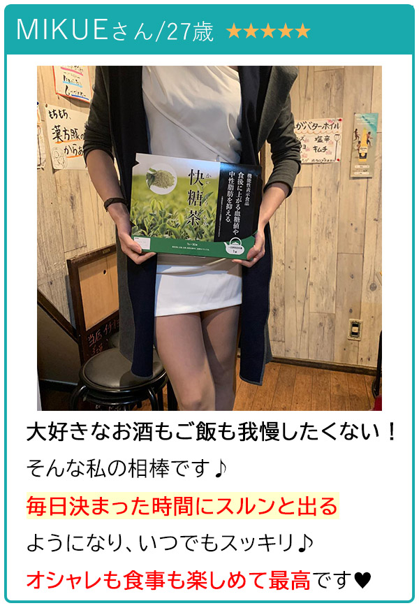 どんなに意識して野菜を食べても、理想量の食物繊維を摂取するのはお金も料理の手間もかかって毎日はムリ。。。でも、快糖茶+はたった1杯飲むだけで、本人も思わずギョッとする量が出るので(笑)目に見えて効果を実感できます!(東京都/34歳)
