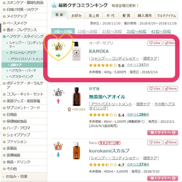 (総合、スカルプエッセンス、シャンプー、スカルプローションでも1位を獲得しています)