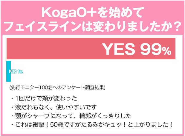 調べてみると、なんとKogaO+を試した100人中99人の女性が効果を実感しているという驚異のデータも出ているんです!
