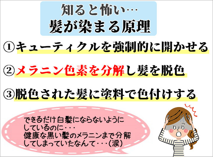 一般的な白髪染めは酸化染毛料というタイプのもので、健康な黒い毛のメラニンさえも壊して脱色してしまいます。