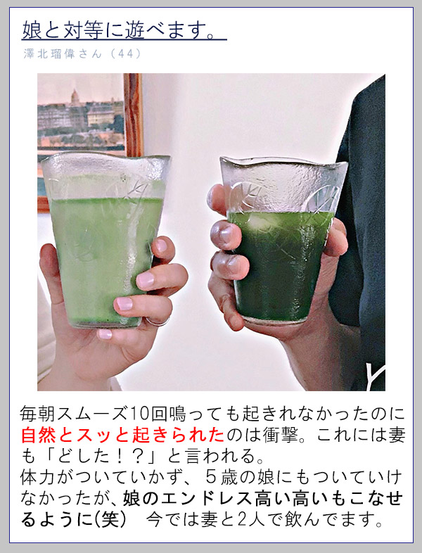 体力仕事なので筋肉はあるはずなのに、40代になってから疲れが抜けなくなり「歳か。。」と諦めていた時にモリンガ青汁に出会いました。お茶感覚で1日1杯飲んでいましたが、なんだか体が軽い。マッサージ後のように体も頭もスッキリしている時間が増え、これは素直に続けたいと思いました。(47歳/青森県)