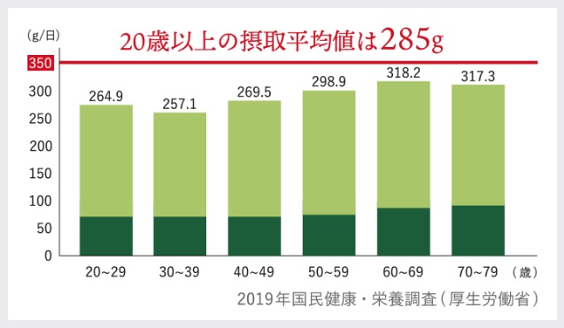 事実、厚生労働省が推薦する1日の野菜摂取量(350g以上)を満たせていない。。