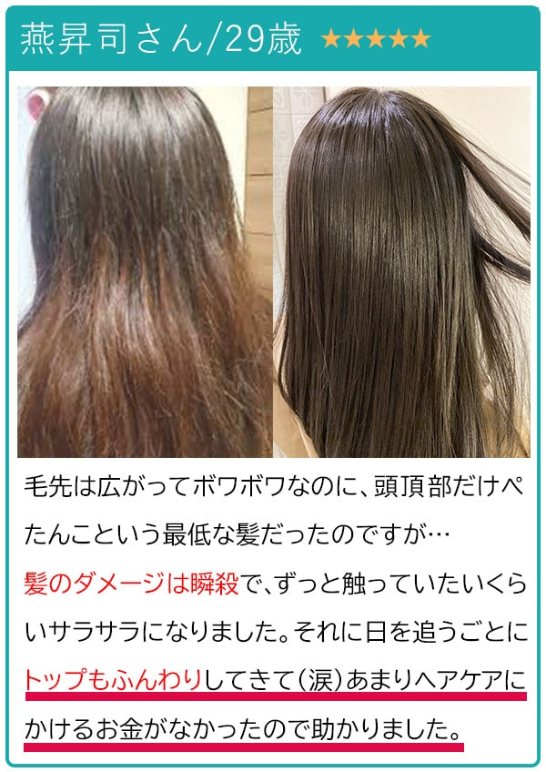 しかも、髪の毛も芯から強くなったようでシャンプーだけでここまで変わるんだと、毎日のケアの大切さを痛感しました。