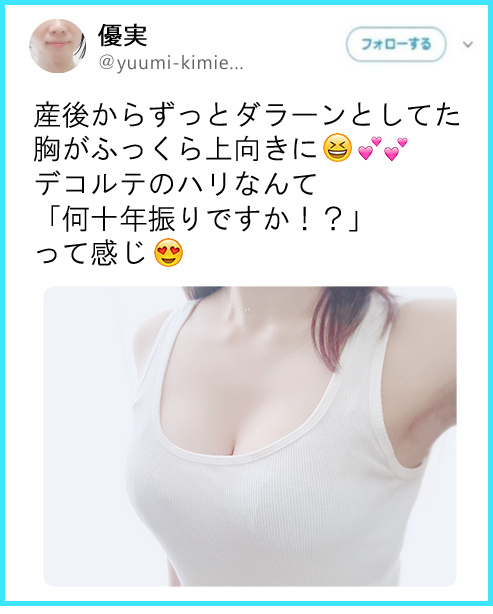 しかも、垂れてしまったバストにも有効だそうで産後で自信がなくなってしまった女性からの支持率もすごかったです。