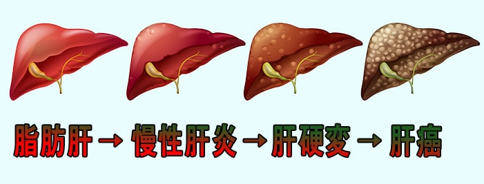 脂肪肝だと気づかぬまま放っておくと、 「肝硬変」や「肝がん」などさらに重い疾患に発展 していく危険性が高まります。