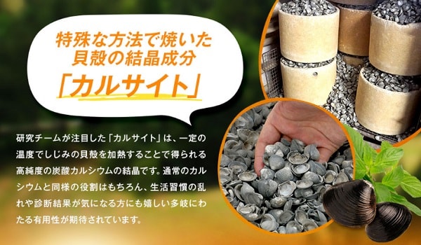 約500℃で焼いたしじみの貝殻に産まれる結晶成分「カルサイト」は肝機能障害改善効果が確認されている新成分です。