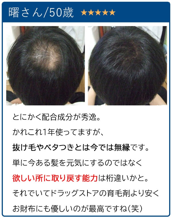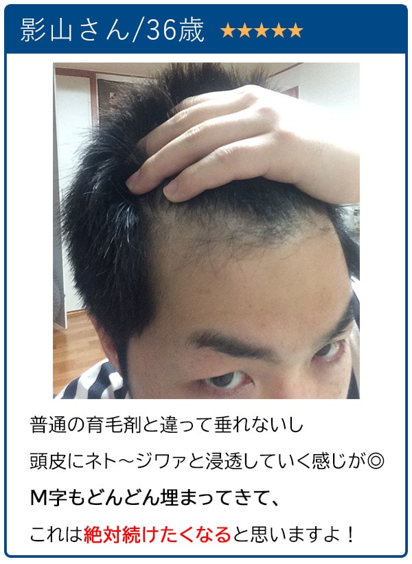 引用元:lineblog頭皮に育毛剤を上手く付けられなかったり、朝ヘアセットの邪魔になったりすることもなく、育毛剤あるあるのストレスが無かったので、億劫にならず続けられます。徐々にですが、確実に髪も太く・濃く・活き活きとしてきて、失いかけていた男としての自信を取り戻せました!